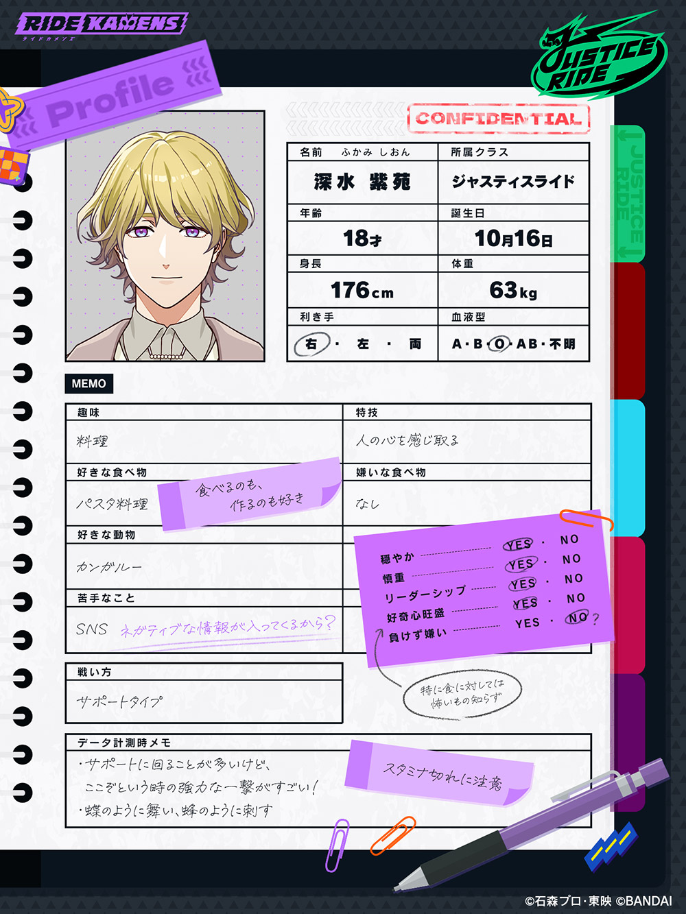 voice01 voice02 voice03 voice01 voice02 voice03 弱さを力に変える心優しき平和主義者 優しい温厚な青年。人の心を感じ取り、言葉の真意や嘘を見抜くのが得意だが、その分感情移入しやすく涙もろい。クラス内ではバランサーの役割を担うことが多い。料理の腕はプロ級で、よく手料理を振る舞っている。 所属クラス ジャスティスライド 身長 176cm 体重 63kg 誕生日 10月16日 年齢 18歳 星座 てんびん座 趣味 料理 特技 人の心を感じ取る 仮面ライダーとしての必殺技 バイオレットスパイラル SHARE