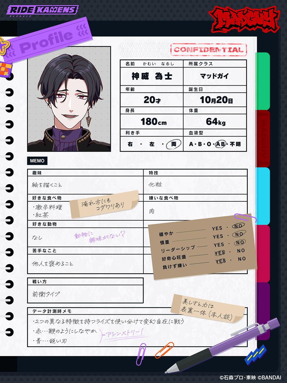 voice01 voice02 voice03 voice01 voice02 voice03 究極の美を追い求めるナルシストな芸術家 己の美しさへの絶対的な自信を持つ美青年。自称天才クリエイター。極度のナルシストで、作品は全て自画像のみ。普段は拠点兼アトリエの廃ホテルで創作活動に勤しんでいる。荒鬼狂介とは犬猿の仲。 所属クラス マッドガイ 身長 180cm 体重 64kg 誕生日 10月20日 年齢 20歳 星座 てんびん座 趣味 絵を描くこと 特技 化粧 仮面ライダーとしての必殺技 絶望と渇望の理 SHARE
