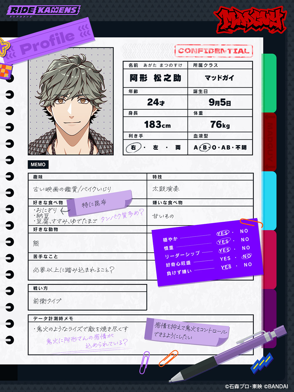 voice01 voice02 voice03 voice01 voice02 voice03 復讐に燃える仲間想いの兄貴分 穏やかで飄々とした好青年。快活で親しみやすい性格だが、カオスイズムに対する憎しみは人一倍深い。普段は魚屋でアルバイトをしている。マッドガイではリーダーを務め、何かと荒鬼狂介と神威為士の世話を焼く。 所属クラス マッドガイ 身長 183cm 体重 76kg 誕生日 9月5日 年齢 24歳 星座 おとめ座 趣味 古い映画の鑑賞/バイクいじり 特技 太鼓演奏 仮面ライダーとしての必殺技 鬼式・紅炎獄 SHARE