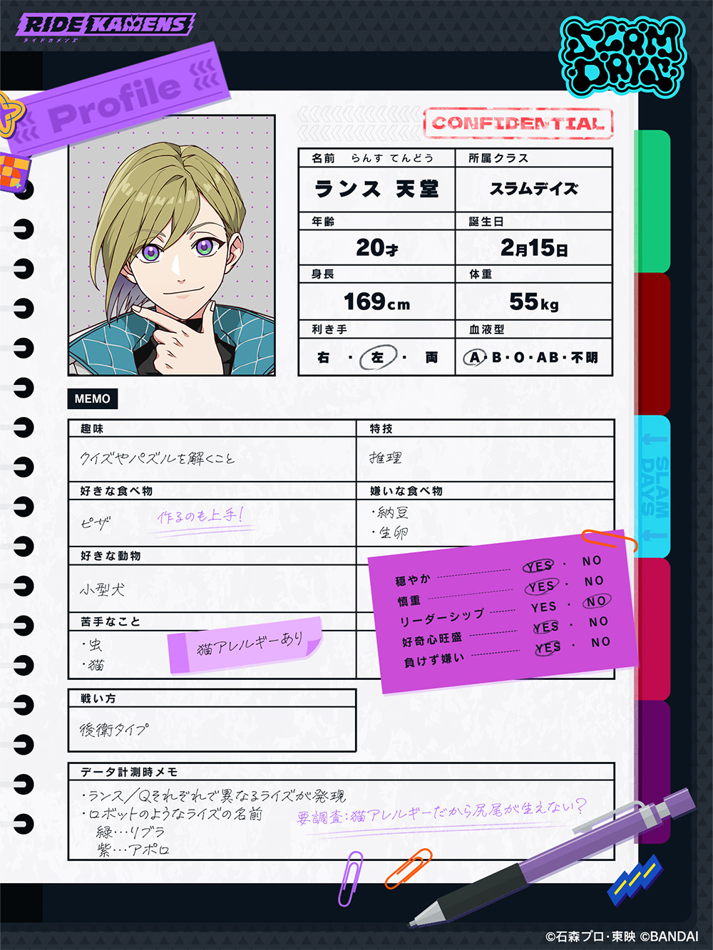 voice01 voice02 voice03 voice01 voice02 voice03 二つの人格を宿す聡明なる帰国子女探偵 聡明で推理が得意な帰国子女探偵。カオスイズムによって生み出されたイタズラ好きなもう1つの人格「Q」との二重人格で、互いに身体の支配権を奪い合っている。メカには少し疎く、謎解きはアナログで行う派。 所属クラス スラムデイズ 身長 169cm 体重 55kg 誕生日 2月15日 年齢 20歳 星座 みずがめ座 趣味 クイズやパズルを解くこと 特技 推理 仮面ライダーとしての必殺技 アポカリプティックツイン SHARE