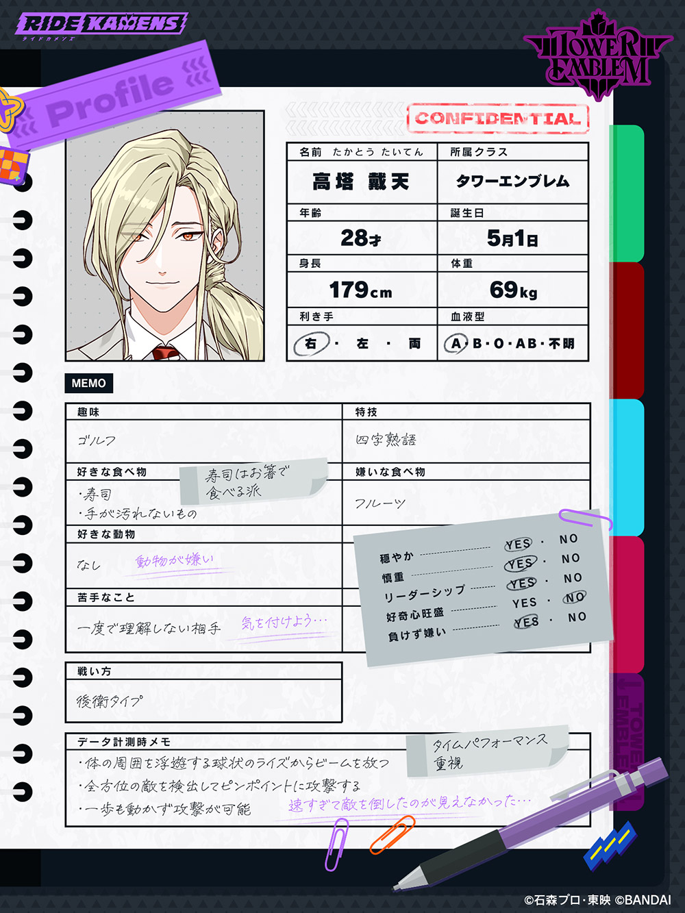 voice01 voice02 voice03 voice01 voice02 voice03 巨大企業を支配する若き指導者(コンダクター) 『高塔エンタープライズ』代表取締役社長。スケジュールが仕事の予定で数か月先まで埋まっているほど多忙なビジネスマン。弟の雨竜の成長を見守りつつ、高塔一族の者として厳しく当たることも。四字熟語を使いこなす。 所属クラス タワーエンブレム 身長 179cm 体重 69kg 誕生日 5月1日 年齢 28歳 星座 おうし座 趣味 ゴルフ 特技 四字熟語 仮面ライダーとしての必殺技 スペクトルジャッジメント SHARE