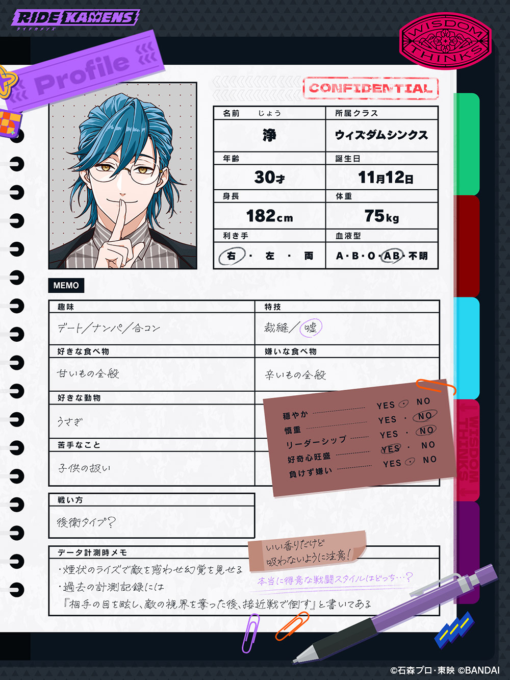 voice01 voice02 voice03 voice01 voice02 voice03 真実を煙に巻き全てのレディを愛する紳士 ラウンジ『ウィズダム』のフロア担当。全ての女性を愛する紳士。飄々として親しみやすい反面、嘘か本当か分からない発言で周囲を翻弄する二面性を持つ。甘いものが好き。 所属クラス ウィズダムシンクス 身長 182cm 体重 75kg 誕生日 11月12日 年齢 30歳 星座 さそり座 趣味 デート/ナンパ/合コン 特技 裁縫/嘘 仮面ライダーとしての必殺技 ミスティカルヴェイパー SHARE